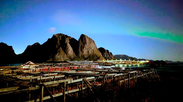 Photo prise à 22H30 avec le téléphone, les séchoirs pour cabillauds éclairés par la pleine lune