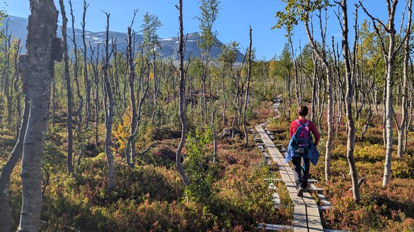 Après une soirée mémorable, nous avons repris la Suède là où on l’avait laissée : au parc national Abisko. Arrivés à 12h30, nous avons préparé les sacs à dos, direction le lac Trollsjon pour une randonnée de 12km aller-retour. Pique-nique au milieu des myrtilles et des airelles, il y en a toujours autant, le rouge est la couleur dominante.