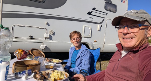 Avec un indice KP très faible, il était à 1,63 nous étions quand même un peu sceptiques. Deuxième signe qui nous a encouragé, c’est que nous étions sur un point de vue où les tours opérateurs amènent leurs clients et en plus sur park4night quelqu’un avait écrit que le 29 août 2024, il avait vu des aurores. Nous étions le 29 août 2025 et même le 30 car on avait mis le réveil à 1h. Pierre avait préparé le trépied, réglé l’appareil photo et immédiatement elles étaient là, pas très intenses mais on les voyait très bien à l’œil nu et pour une première ce fût pour nous une soirée réussie.