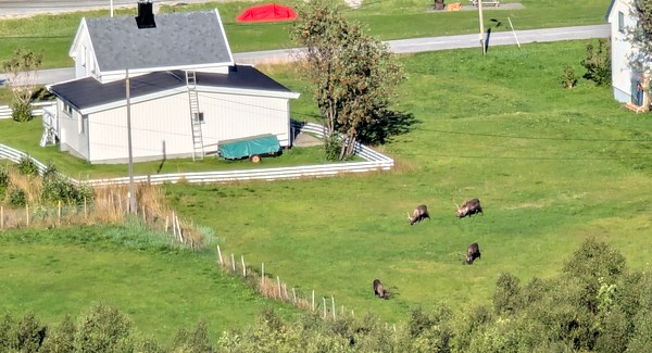 En bas sur la plage, des rennes se baladent dans un jardin.